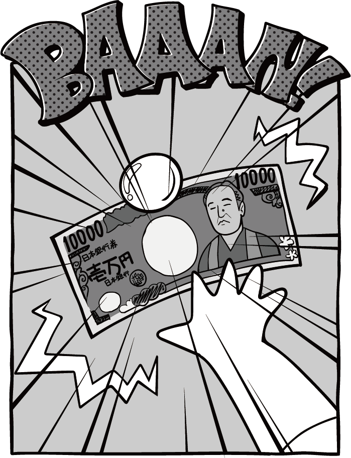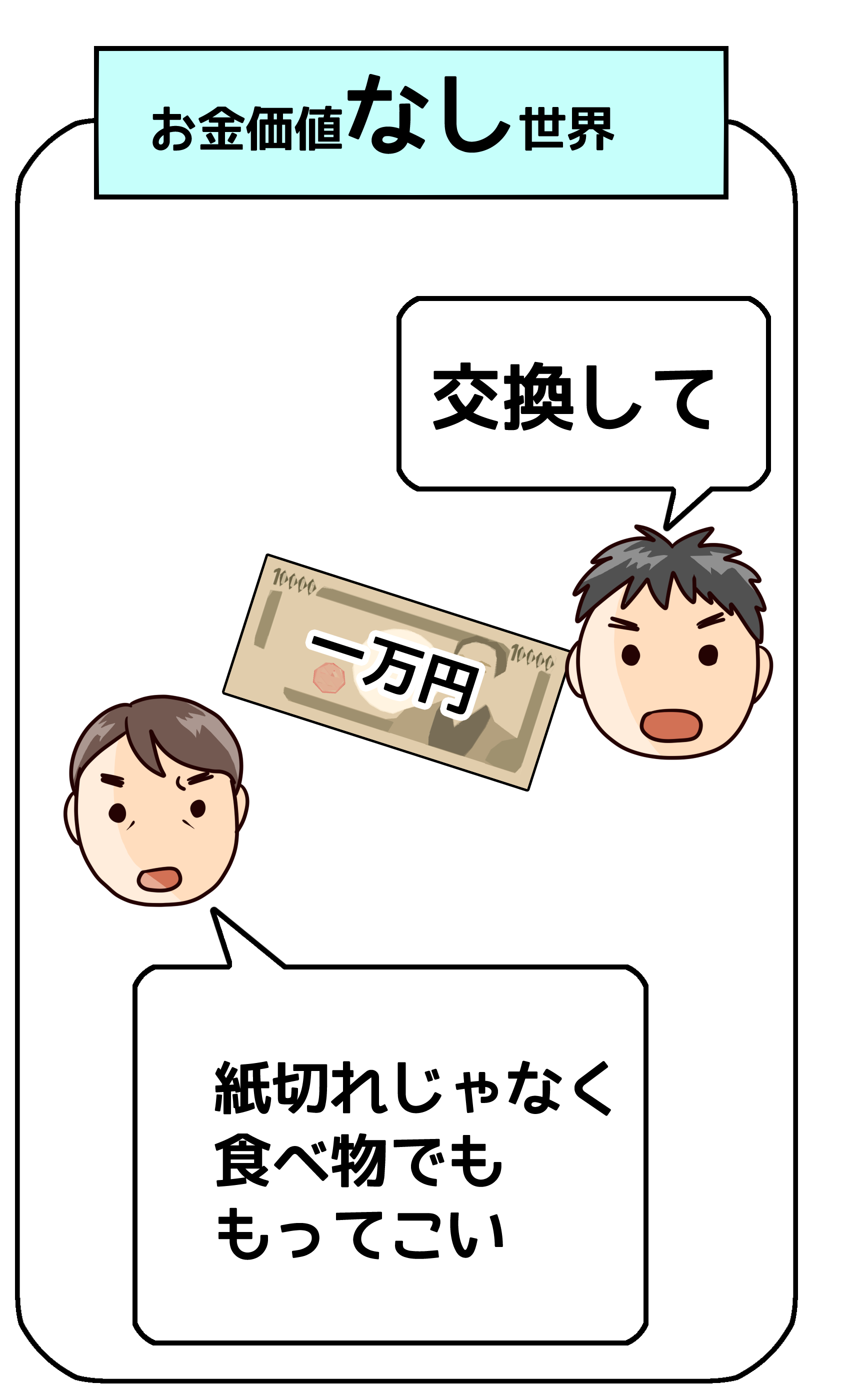 センセ、頭、大丈夫ですか? お店に行って、一万円札を渡せば、あんパンとかチョコレートとか、いっぱい、くれるってことですよ。