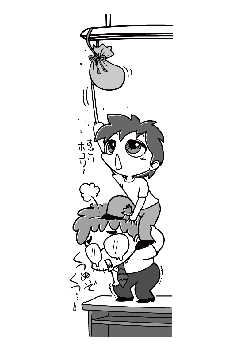 昨日の花子さんのマネをして、この偽ダイヤめって、ダイヤ入れた袋を投げたら、天井にひっかかったんだ。