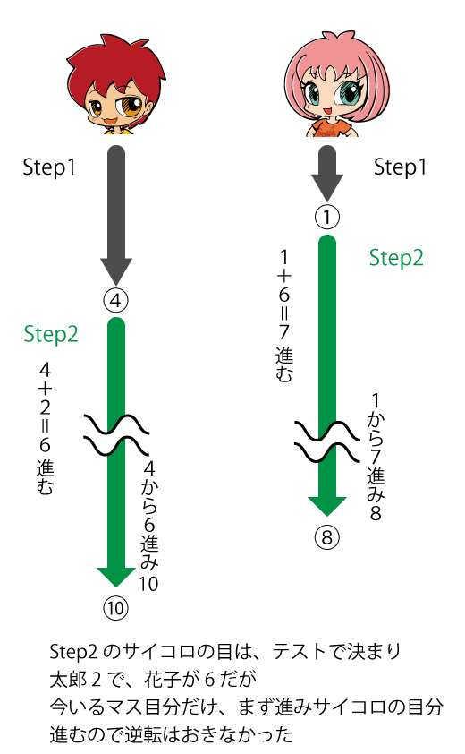 そうそう。Step1のサイコロの目の影響は大きいね。でも、逆転がないわけじゃないよ。
