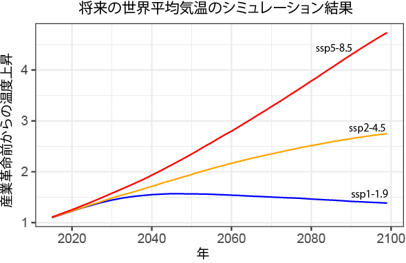 sspは、IPCC第六次報告書で使われるシナリオ。 くわしくは、外部リンク:(全国地球温暖化防止活動推進センターのWebページ)を参照。なお、climate Action Trackerによると、現行政策の延長で2100年に2.7度上昇とあるため、以下でssp2-4.5を現行政策の延長と表現。パリ協定に基づく各国の目標はこれよりも下になると考えらる。