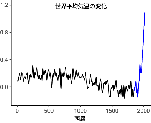 地域によって、この線より暖かかった所があったりしたわね。でも、世界的な平均をとるとこうなるの。海の上も含めた世界平均温度が、こんなに早く変わるのは珍しいのよ。「何世紀も何千年もの間、前例のなかったもの」とIPCCのレポートにあったわ。