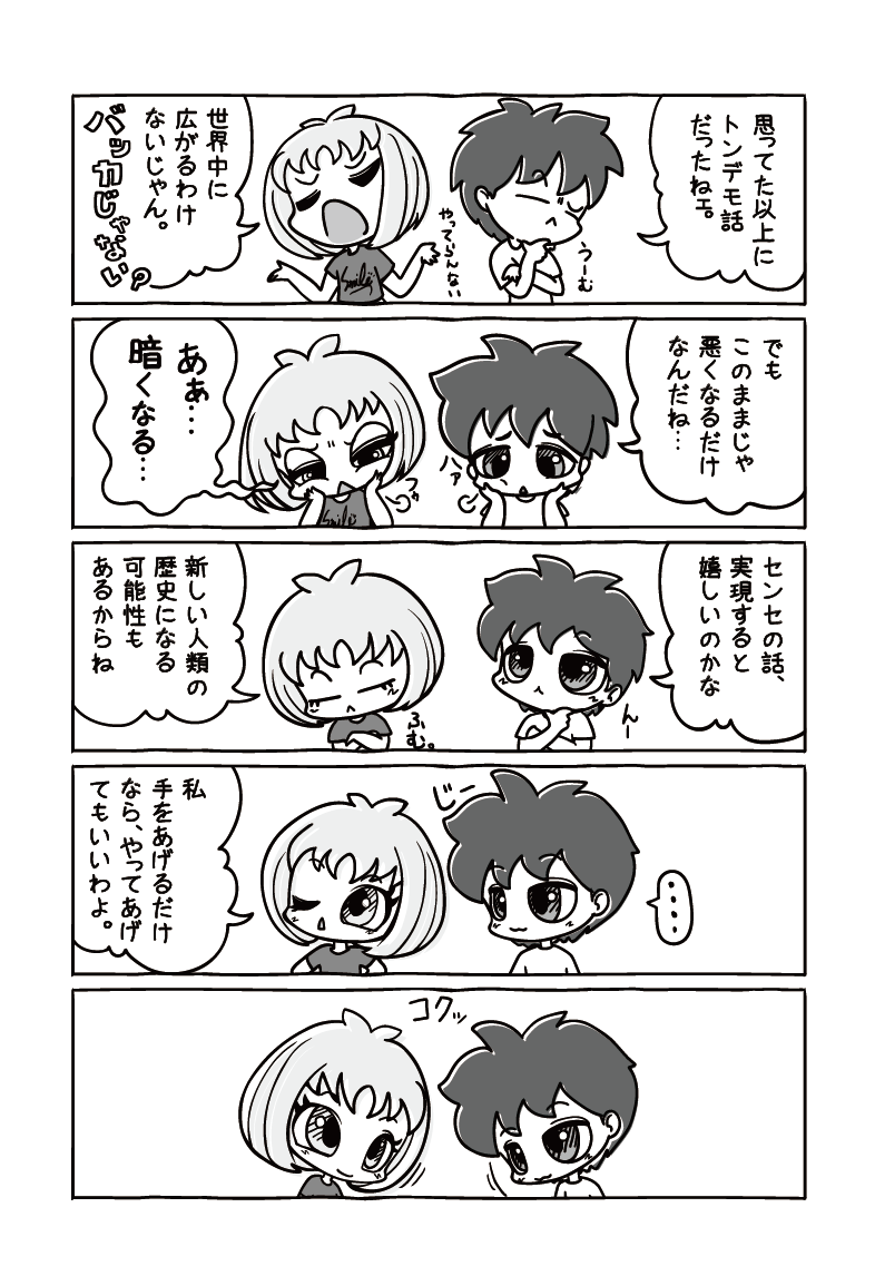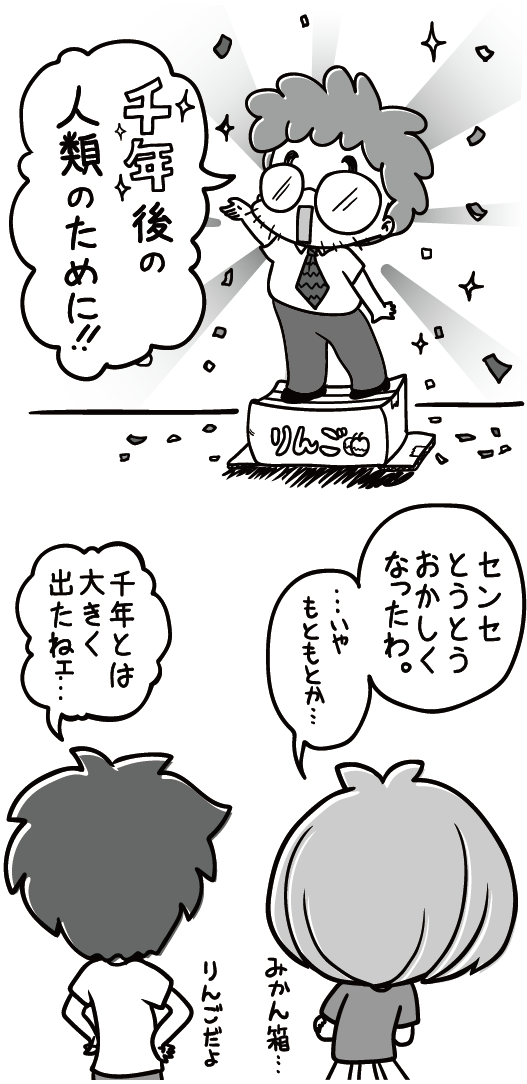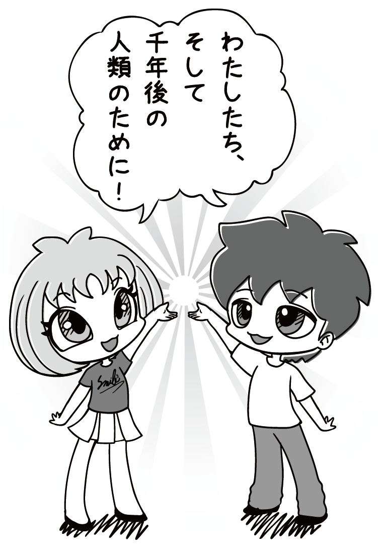 「われわれ人類は運命を共にする仲間。こころを一つにしよう。わたしたち、子供たち、そして、千年後の人類のために!」